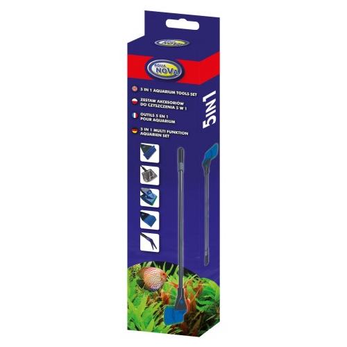 5dílná sada akvarijních potřeb obsahuje: síťku, škrabku, čistící houbu, sázeč rostlin a hrabičky na štěrk.